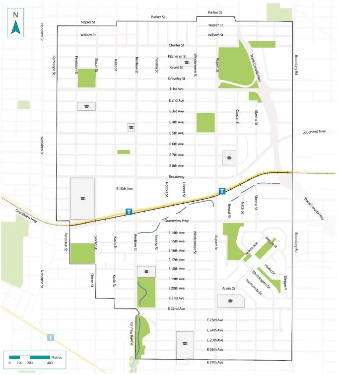 东至Boundary、西至Kamloops、南至E27th、北到Parker St,涵盖Millennium Line的Renfrew与Rupert两个天车站,区域总面积达1,631英亩(660公顷)!